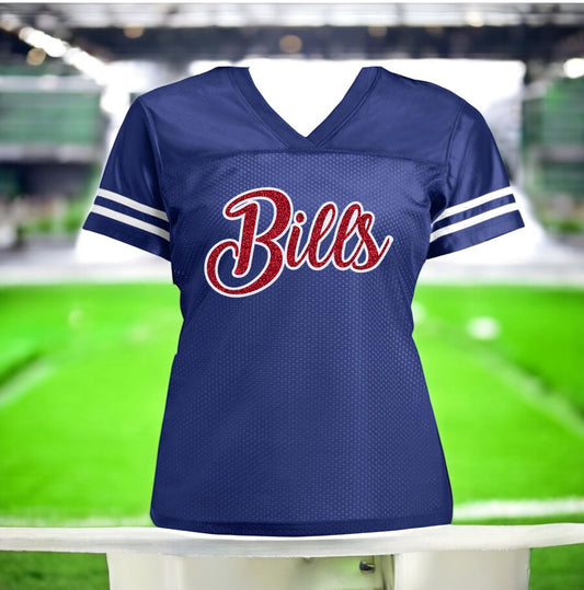 Bills Glitter Football Jersey, Script Lettering in Red & White on Royal Blue Jersey