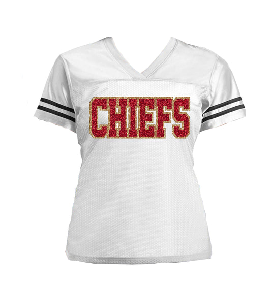 Chiefs Glitter Football Jersey, Red White Gold Kansas City Women's Shirt