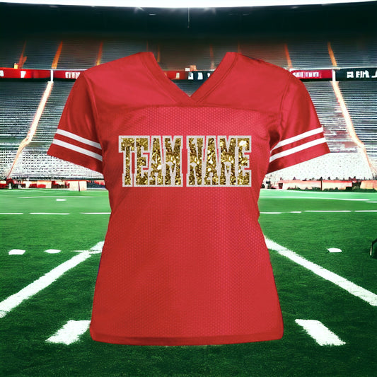 Red Gold Glitter Personalized Football Jersey Shirt for Ladies and Moms
