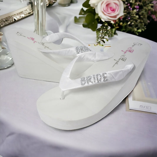 Flip Flops with Glitter Bride on Satin Straps -White Flat with Silver or Choose Your Wedding Colors