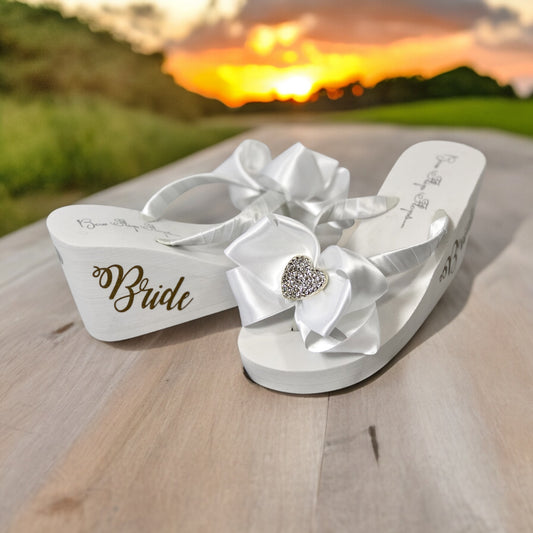 Bride Heart Bow Flip Flops , Choose Colors Heel and Rhinestone Embellishment