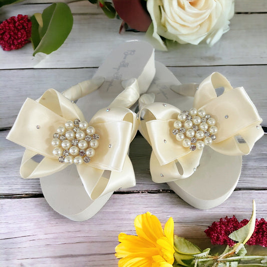 Pearl Bow Flip Flops with Crystal Rhinestone Accents, White or Ivory