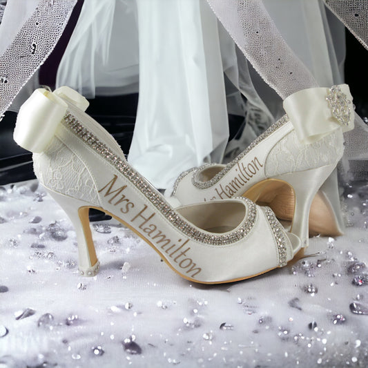 Lace & Satin Peep Toe Wedding Heels with Personalized Name & Date