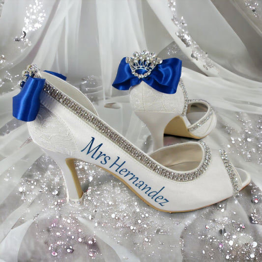 Royal Blue Princess Crown Wedding Heels, 3.5 Inch White or Ivory, Customizable