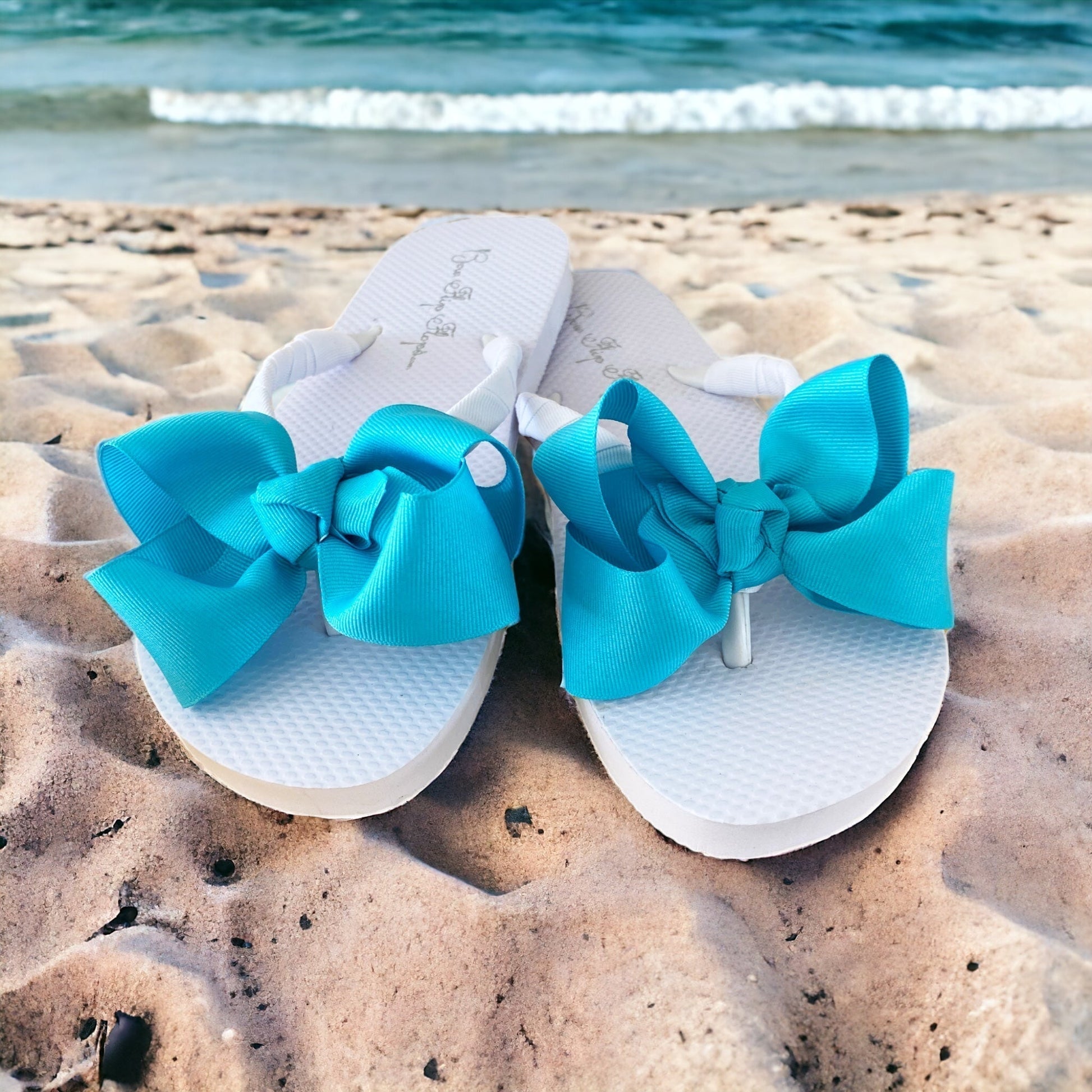 Black or white flat flip flops with ribbon wrapped straps. In the center is a cute grosgrain bow with knotted center.